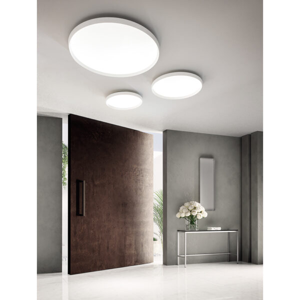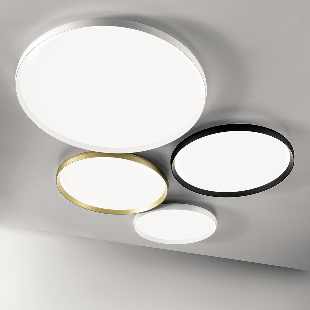 Montatura in alluminio satinato bianco, nero o oro spazzolato. Diffusore in metacrilato bianco opale. Possibilità di scegliere la temperatura della luce (3000°K o 4000°K) prima dell’installazione finale della plafoniera. Sorgente luminosa led dimmerabile a taglio di fase tramite dimmer esterno+push (non inclusi).