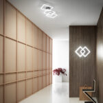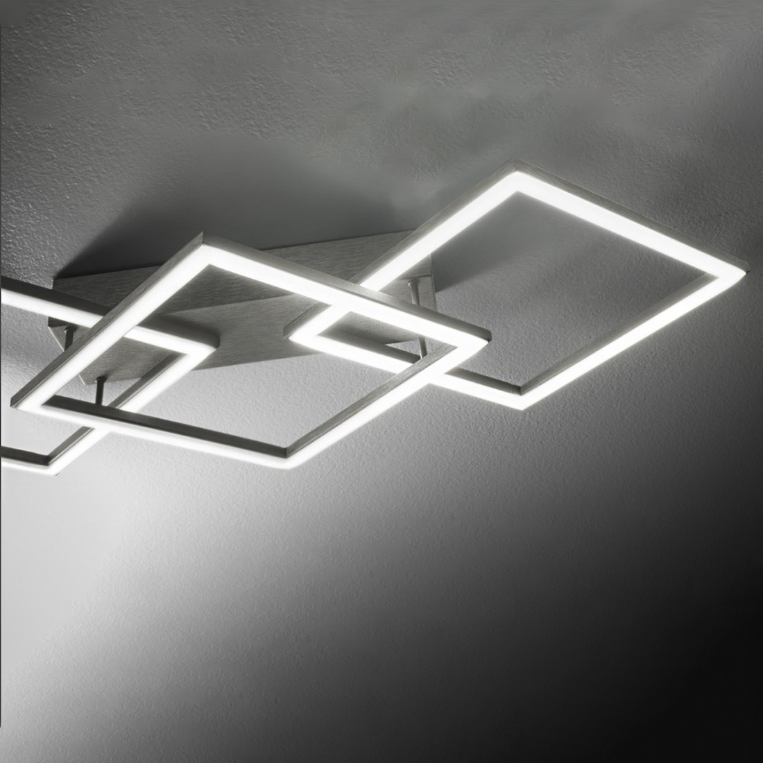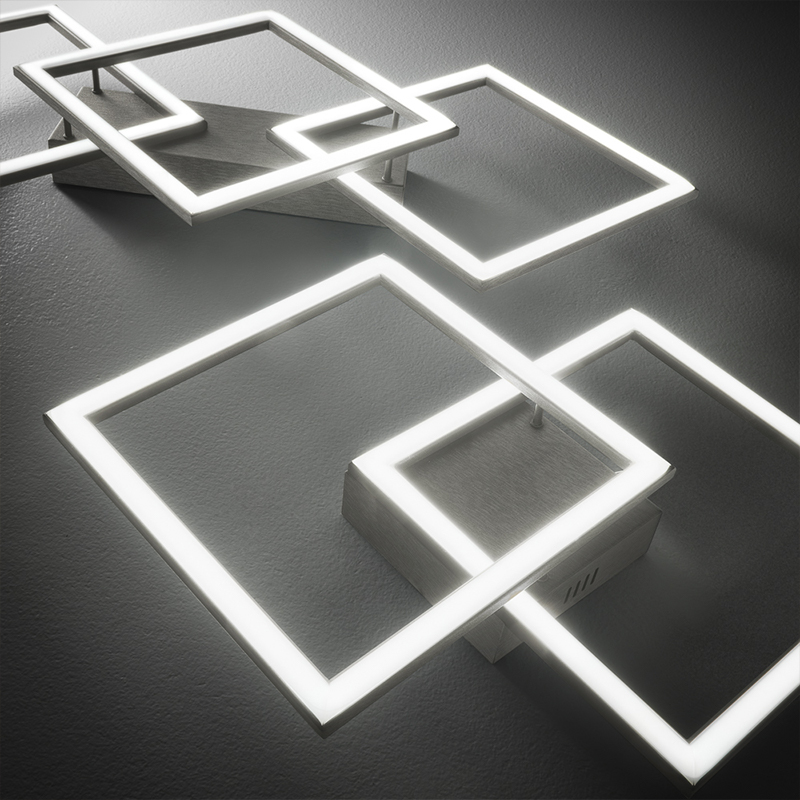 Montatura in alluminio bianco satinato, oro spazzolato o titanio. Diffusore in silicone bianco opale. Sorgente luminosa led dimmerabile tramite dimmer esterno.