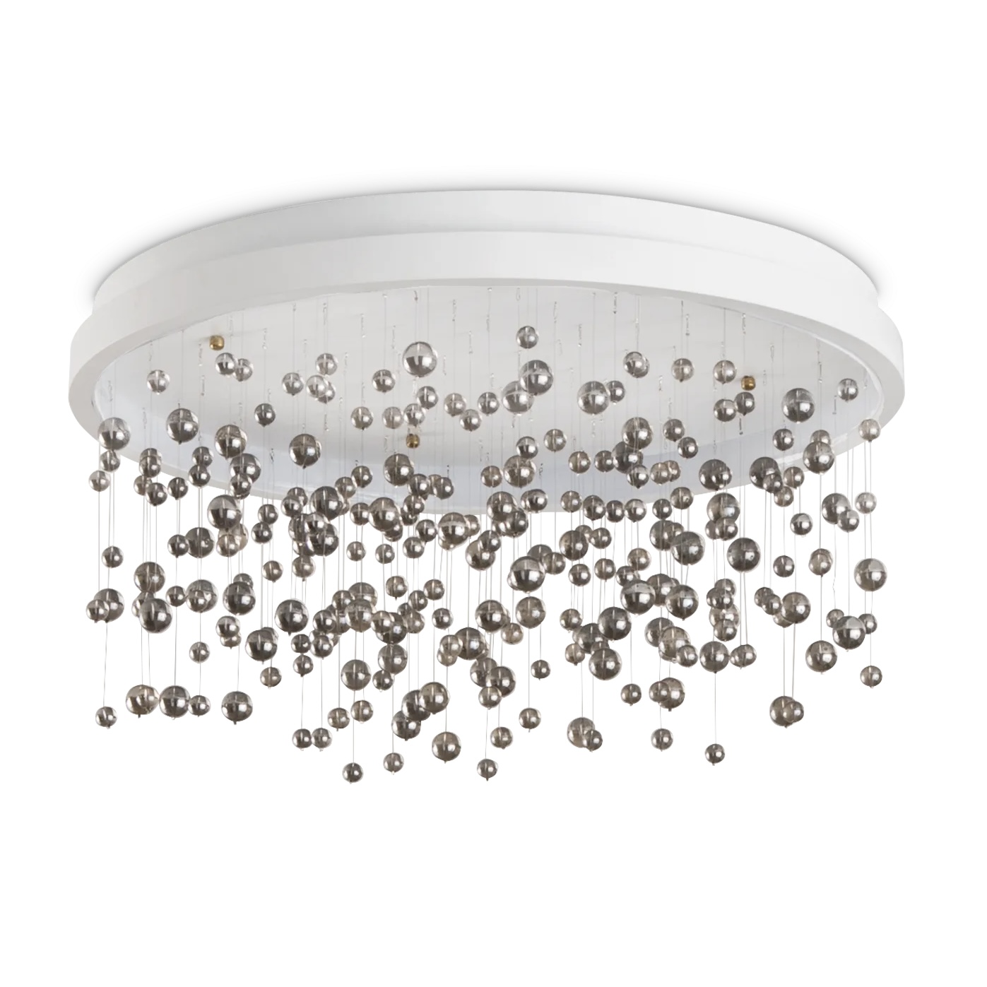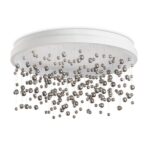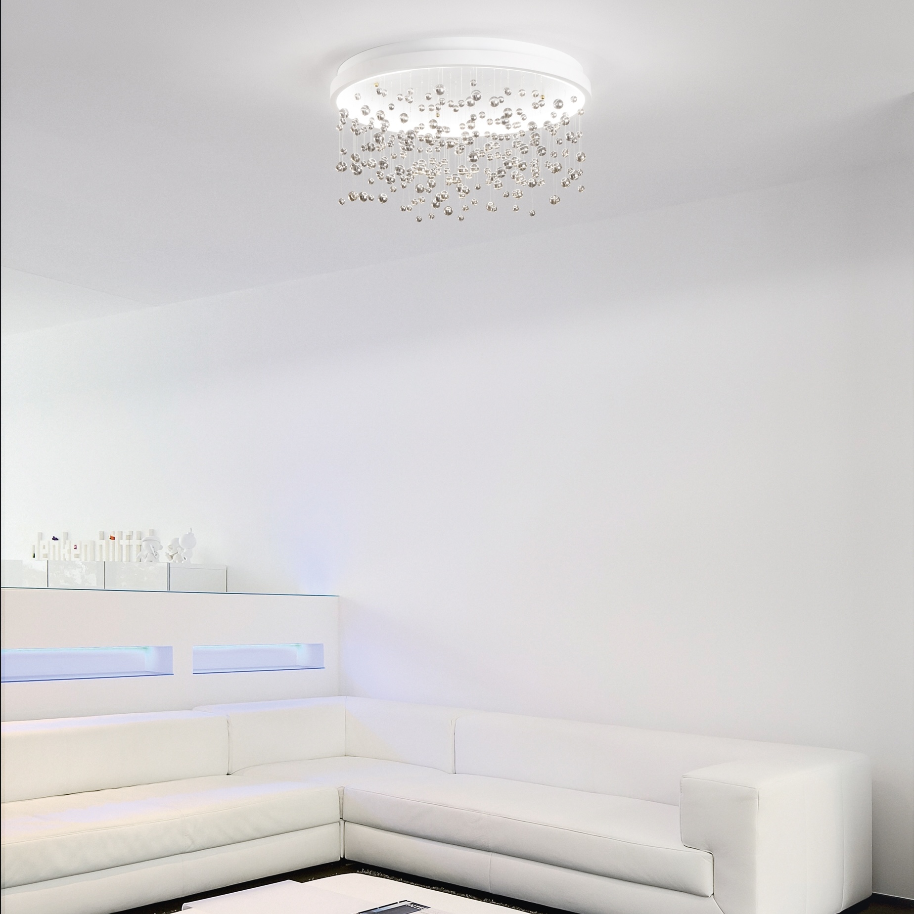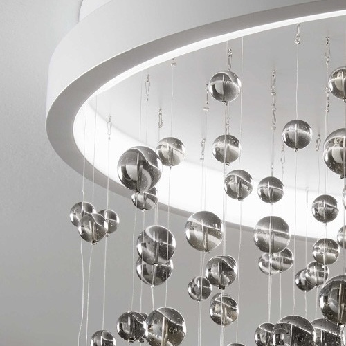 Montatura in metallo verniciato opaco. Elementi decorativi pendenti in filo metallico con perle di vetro trasparente cromato. Finiture: bianco.