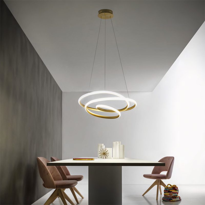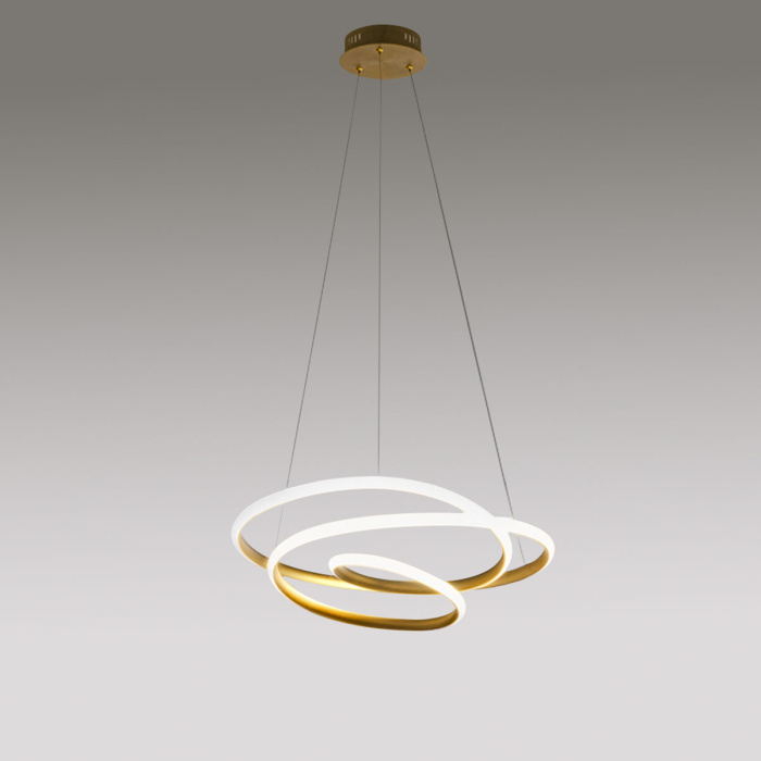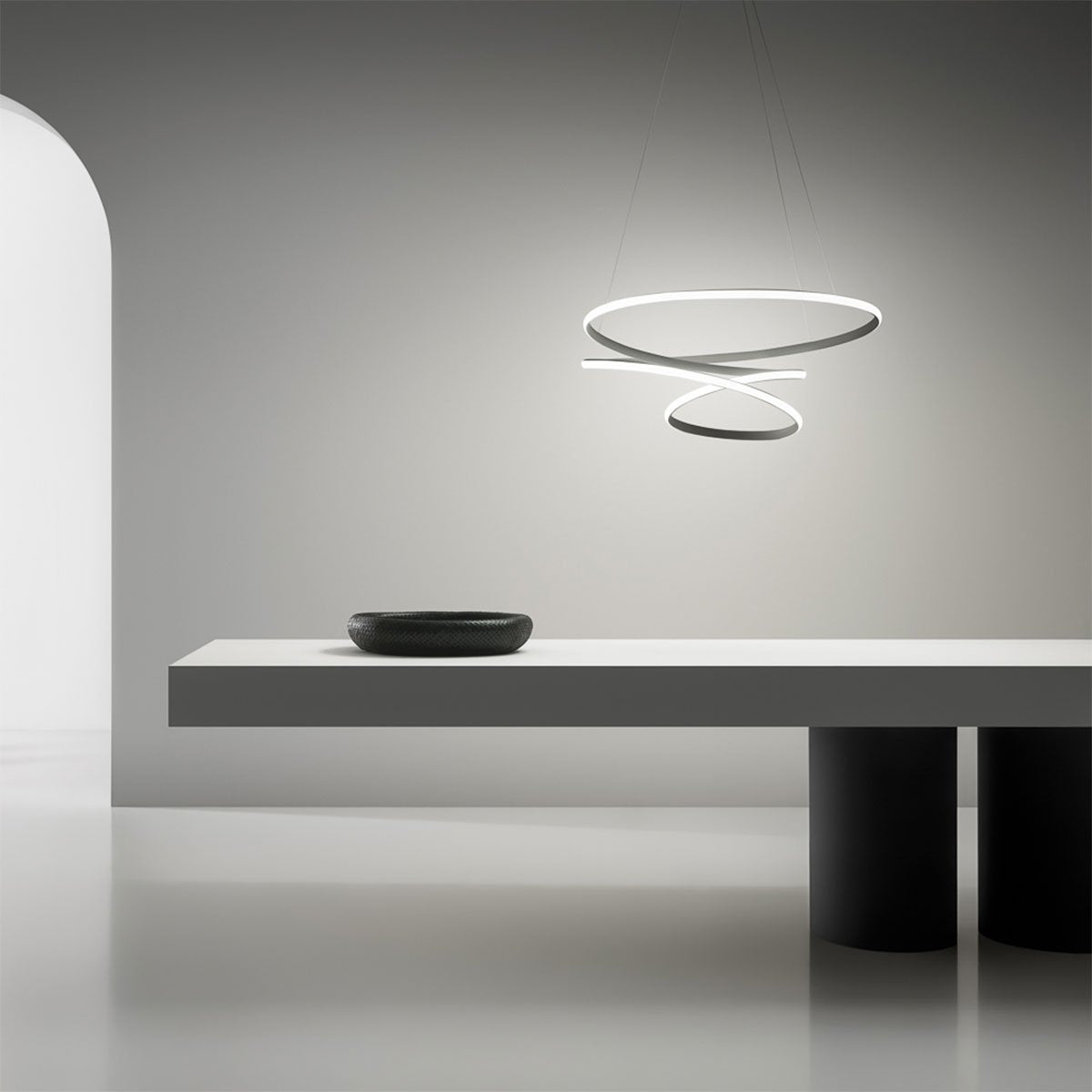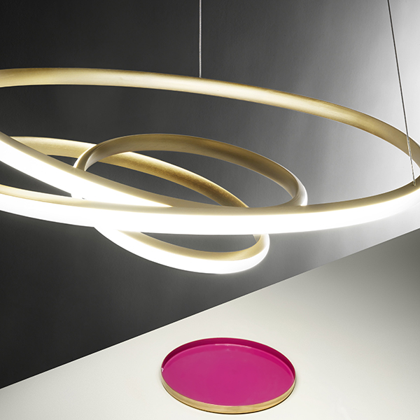 Montatura in alluminio bianco satinato, oro spazzolato o titanio. Diffusore in silicone bianco opale. Sorgente luminosa led dimmerabile a taglio di fase tramite dimmer esterno non incluso.