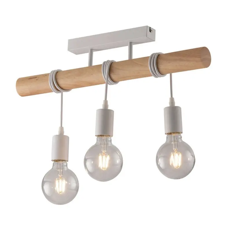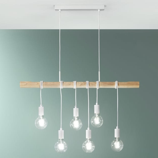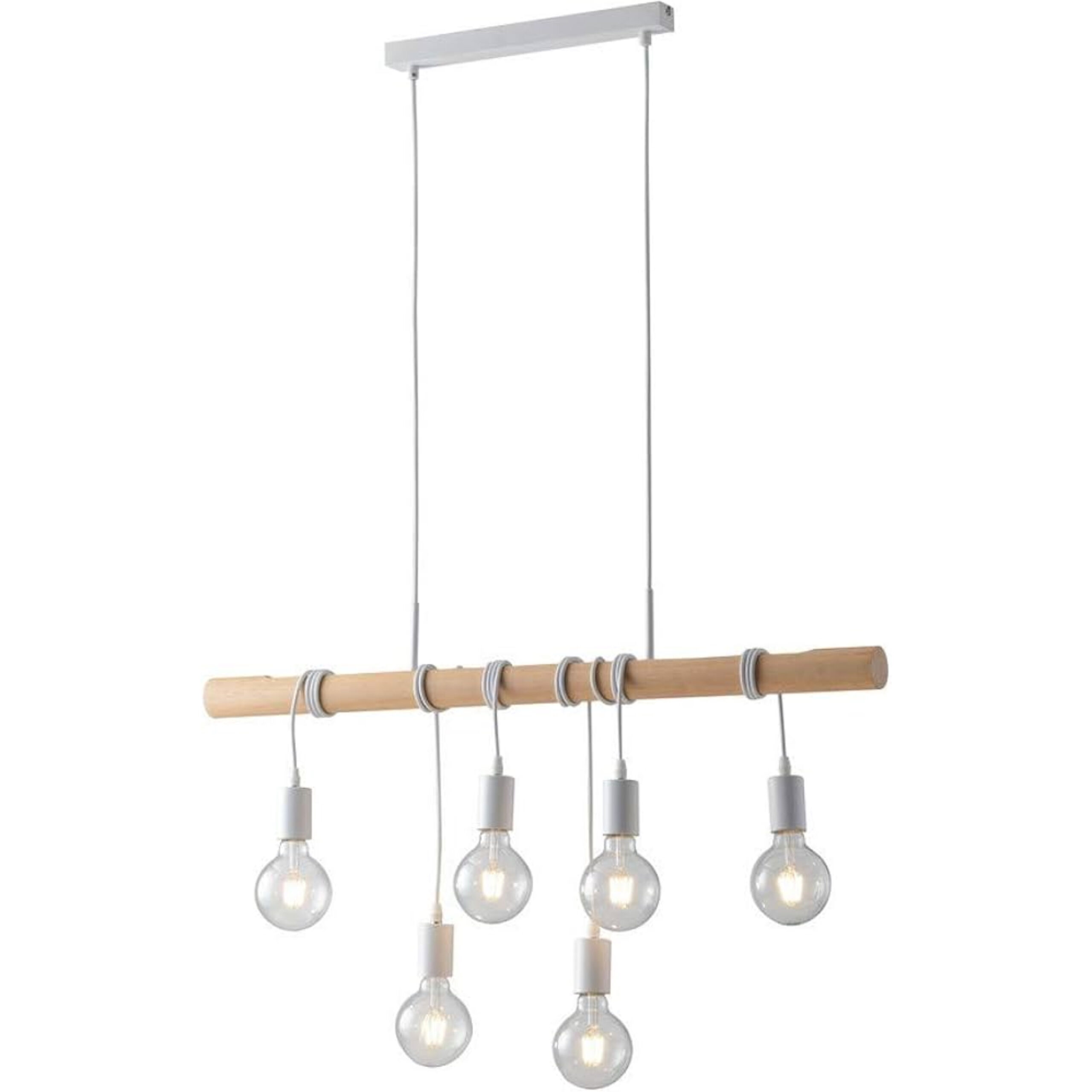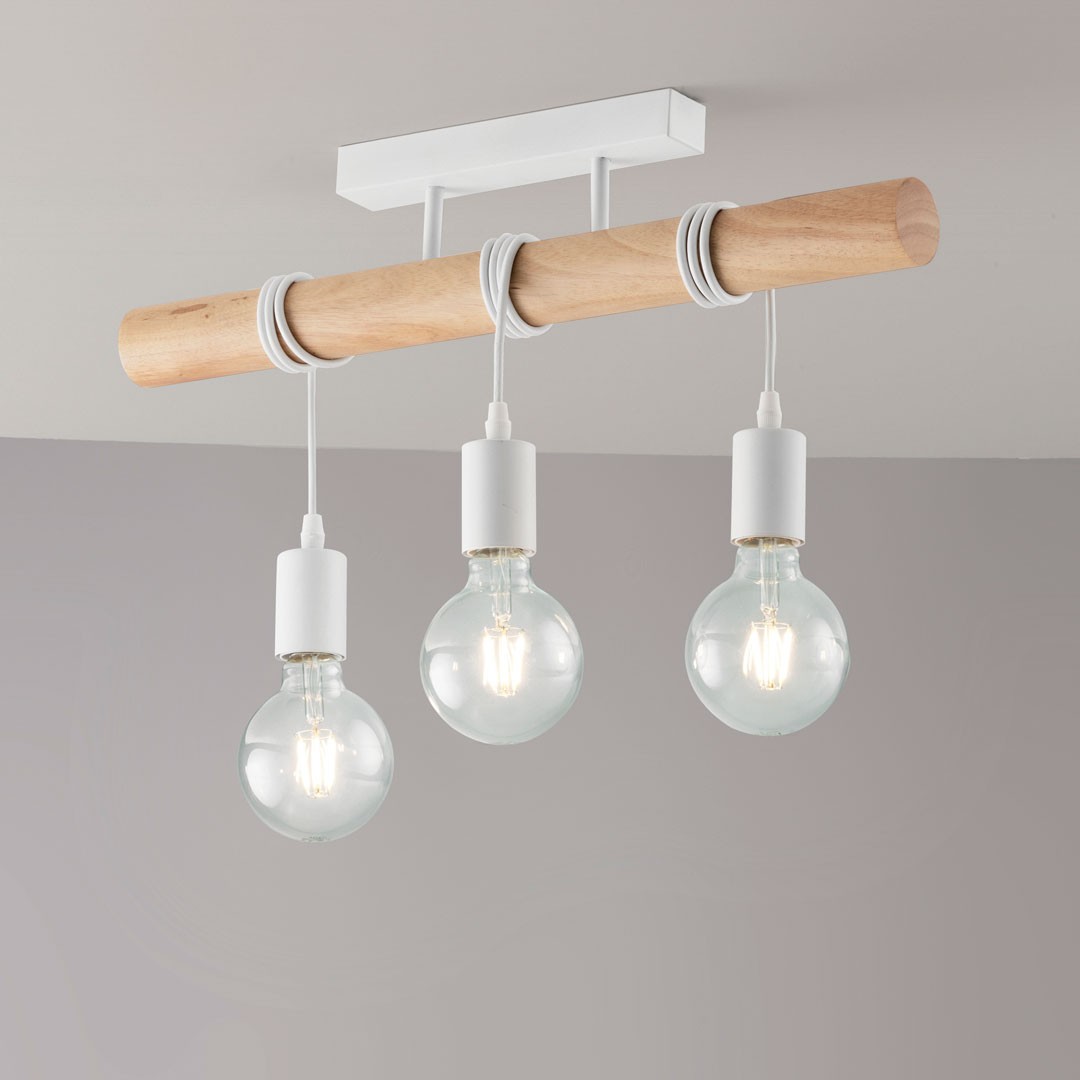 Collezione con struttura cilindrica in legno naturale e montatura in metallo bianco opaco.
