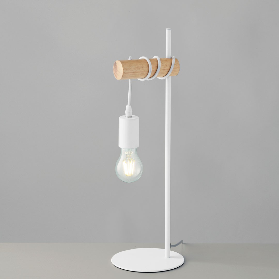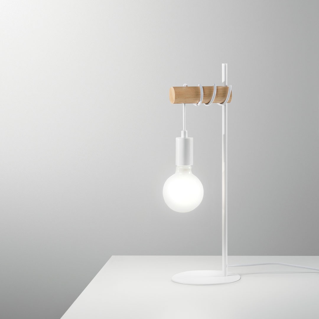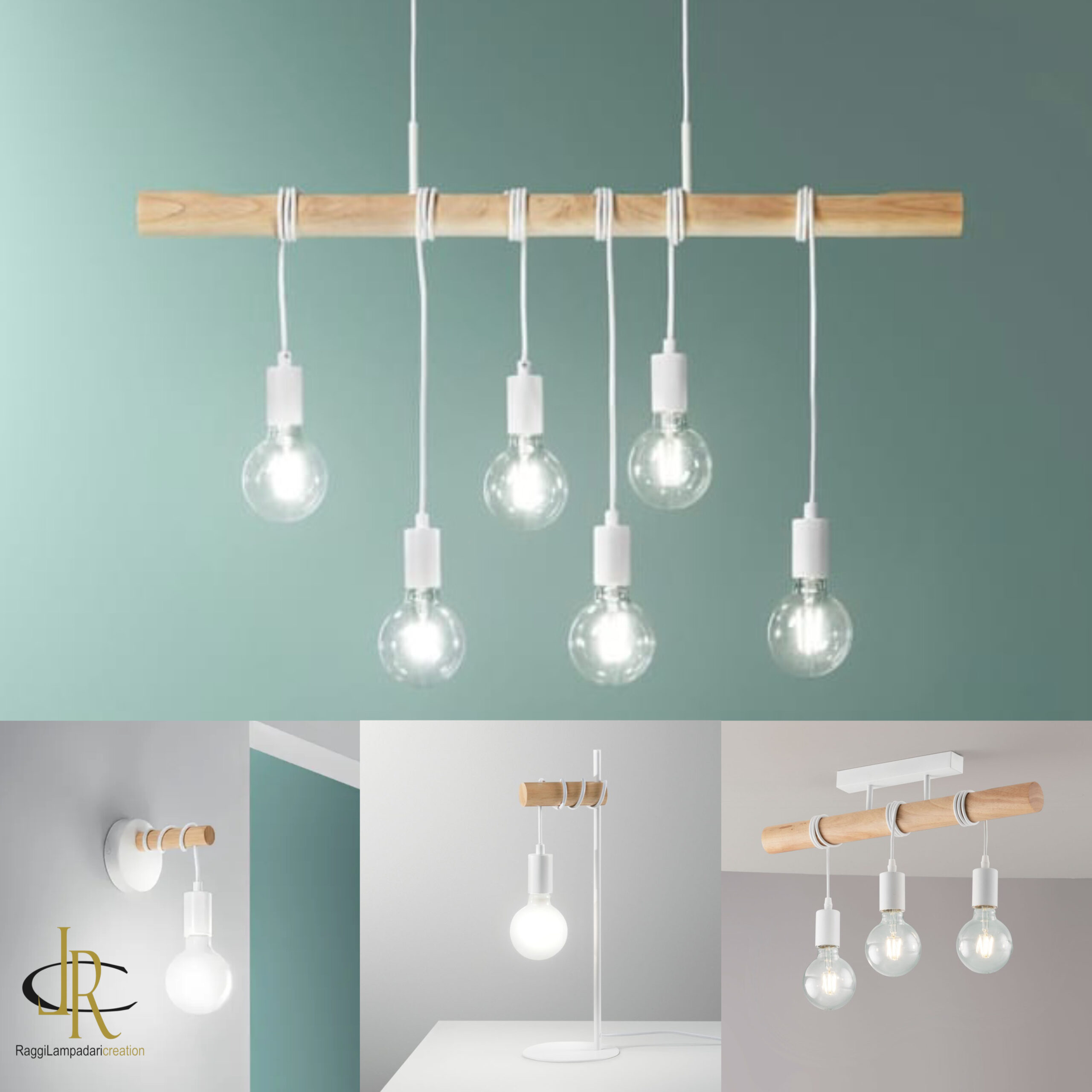 Collezione con struttura cilindrica in legno naturale e montatura in metallo bianco opaco.