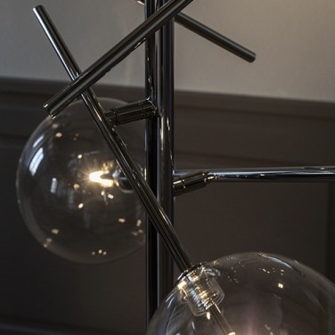Montatura in metallo placcato. Diffusori in vetro borosilicato trasparente. Colori montatura: cromo con vetro trasparente o fumè sfumato, montatura ottone antico con vetro trasparente o ambra sfumato.